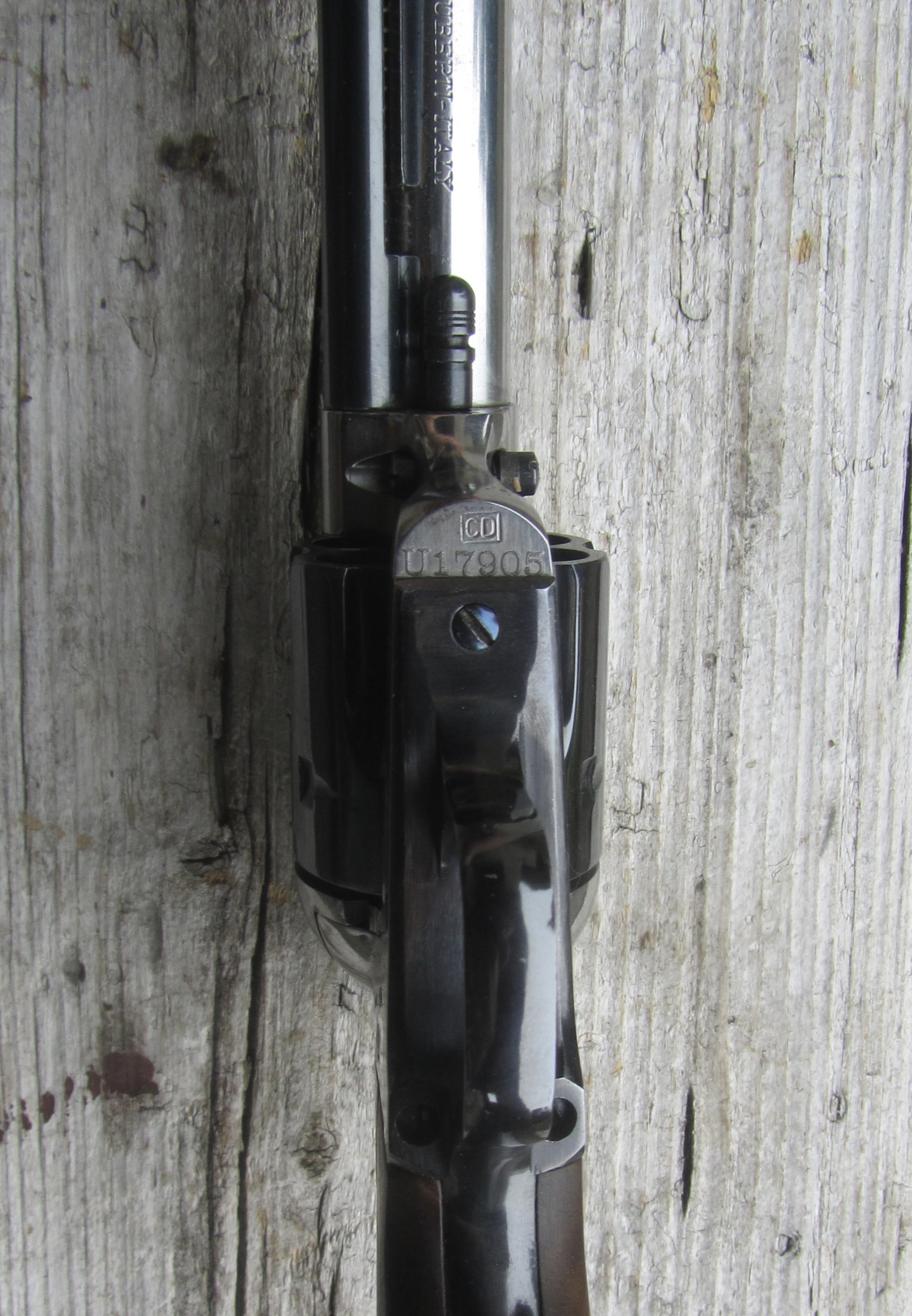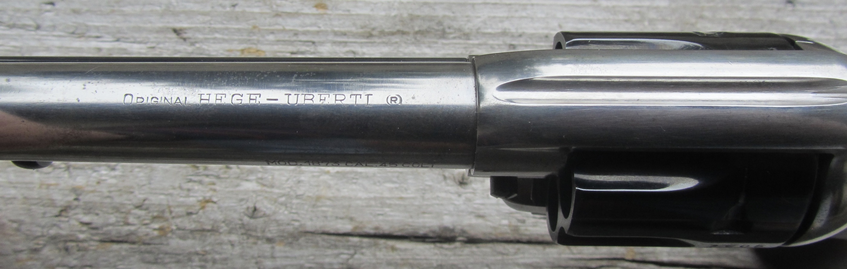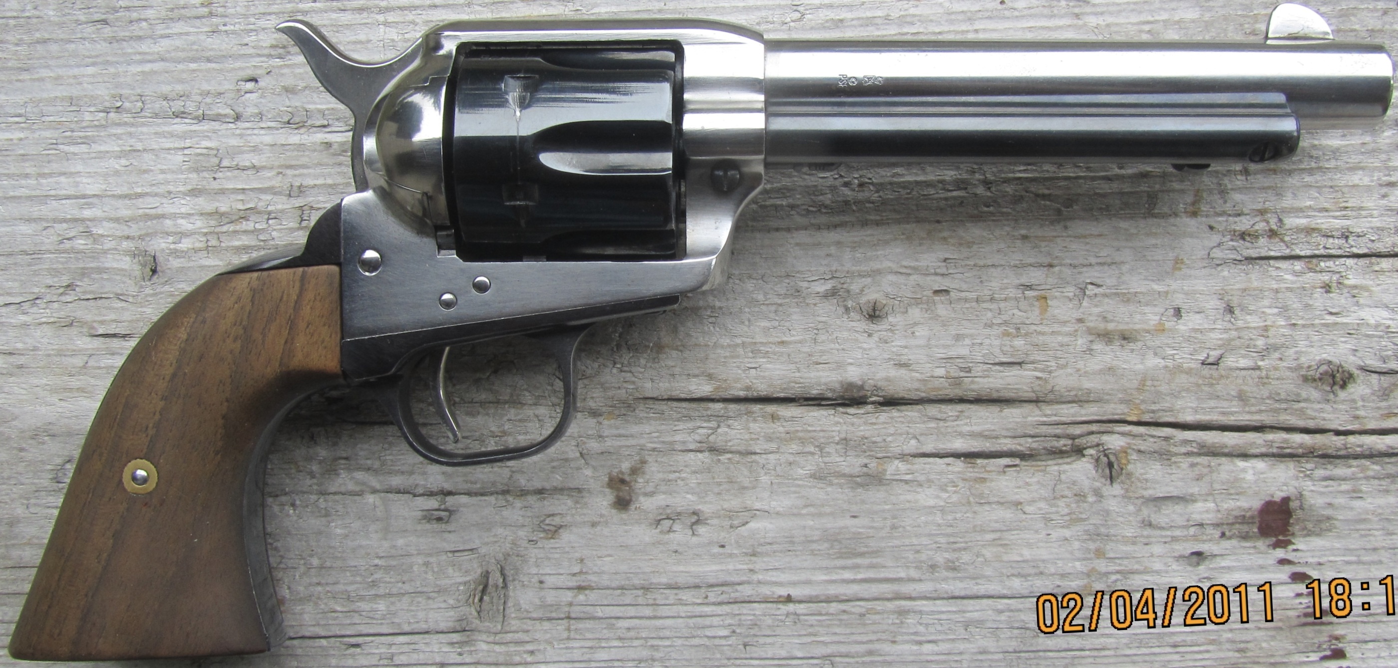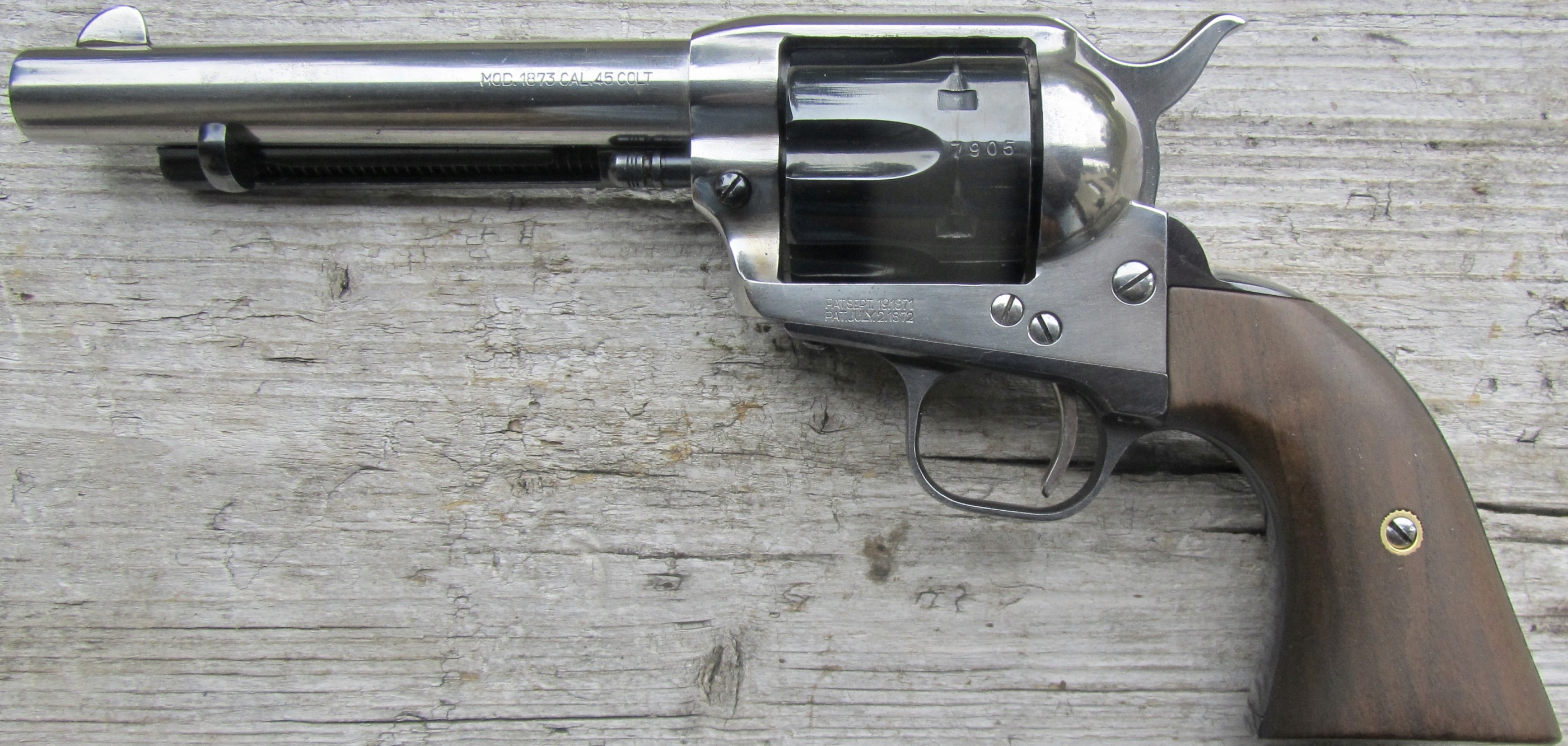 Replika av Colt Model 1873 Army Revolver. Tillverkad på 00-talet. Kaliber .45 Colt, patronladdad. Sex skott, single-action. Polerat rostfritt stål, med blånerad trumma. 5.5" pipa. En modern replika av mycket hög kvalitet. Nyskick.