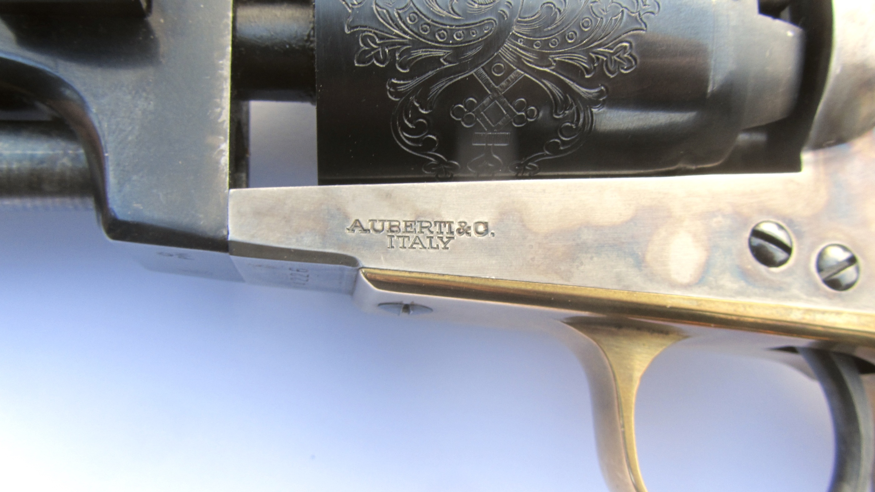 Blånerad med flamhärdad hane, laddarm och stomme. Kolvträ av valnöt. Backstrap och varbygel av mässing, ingen försilvring eller annan plätering. Den efterliknar alltså ett militärt exemplar men saknar urfräsningarna för löskolv.. Hursomhelst en fin kopia av en välkänd och ofta dyrbar modell av Colt.