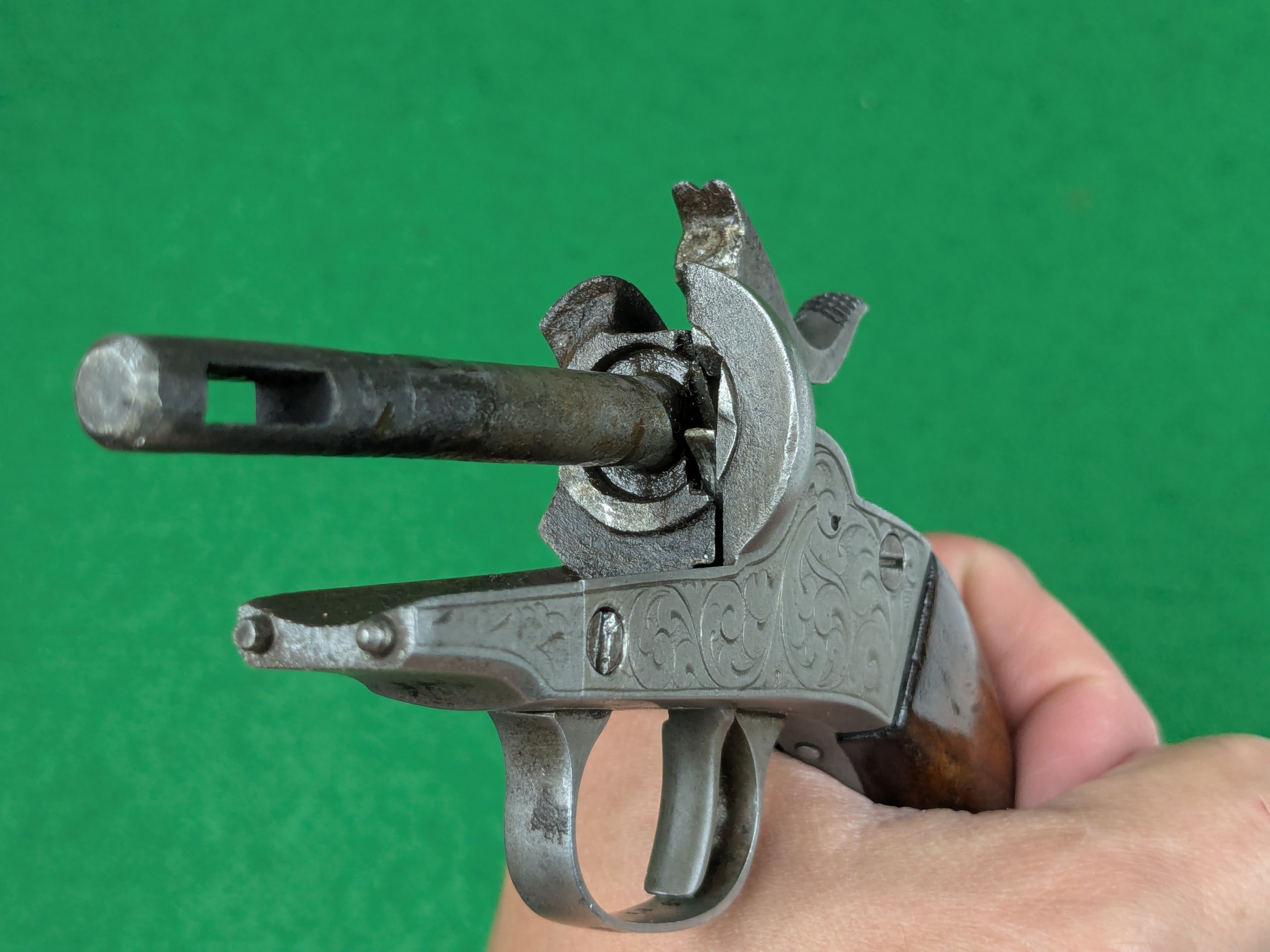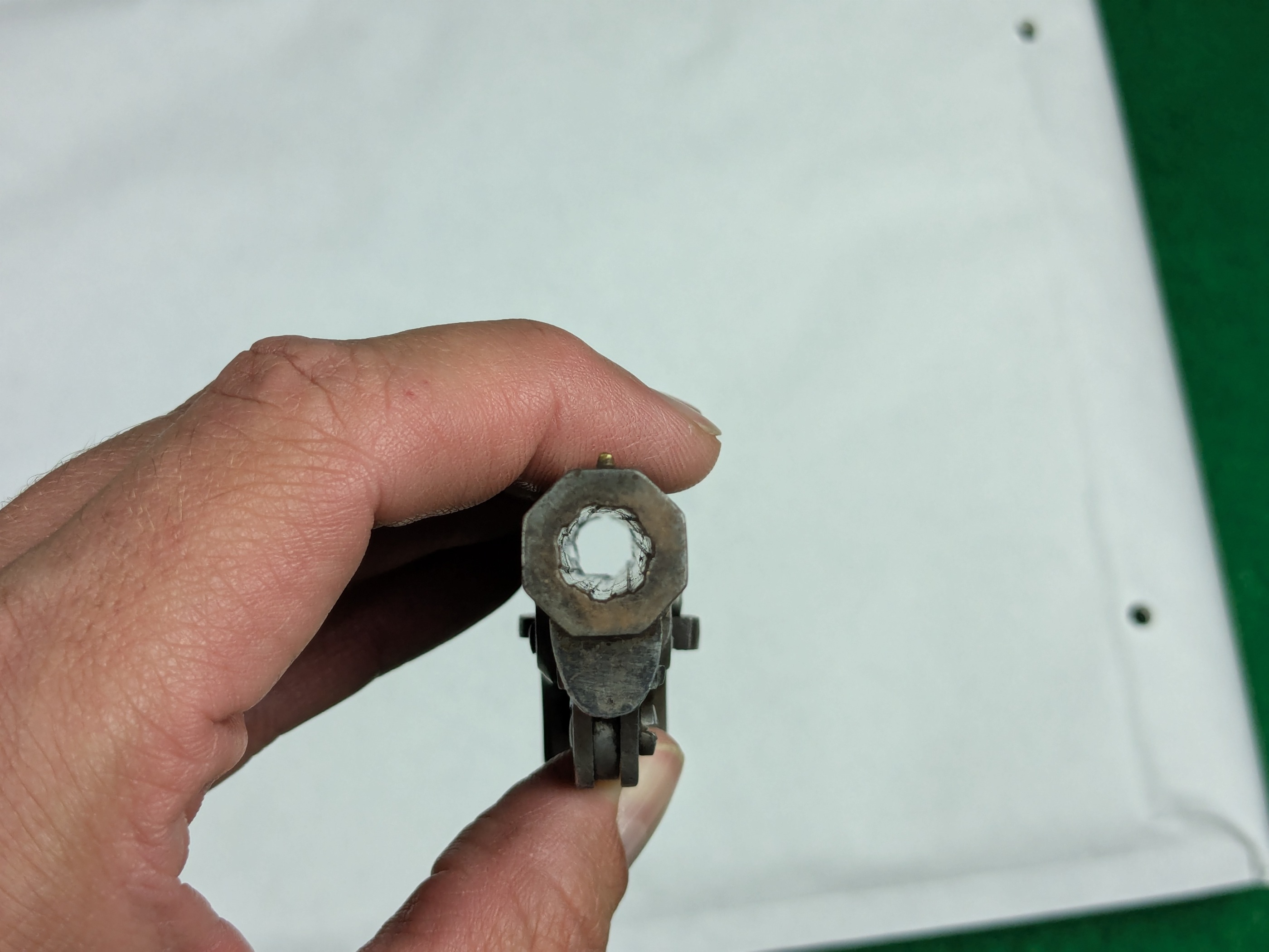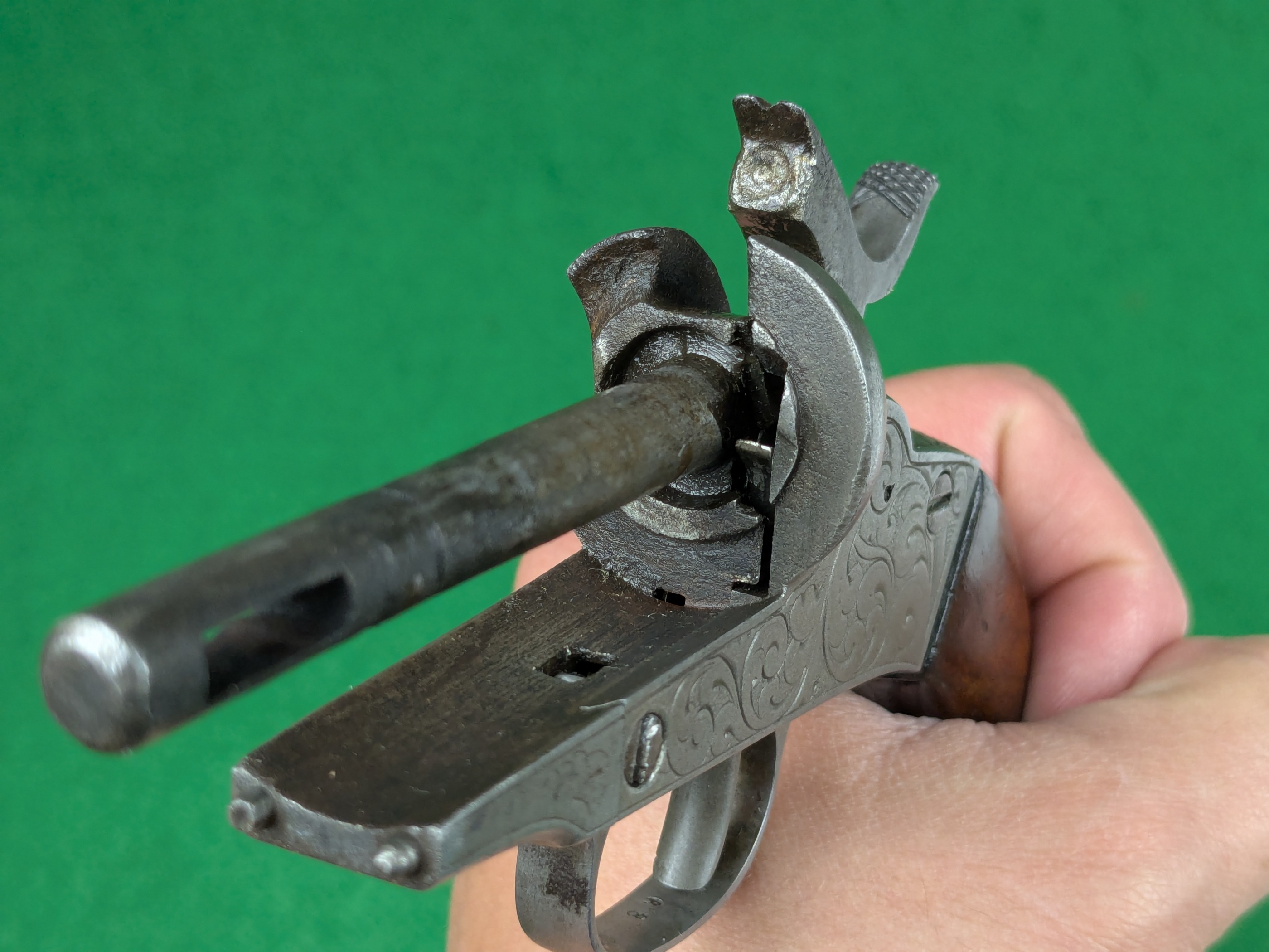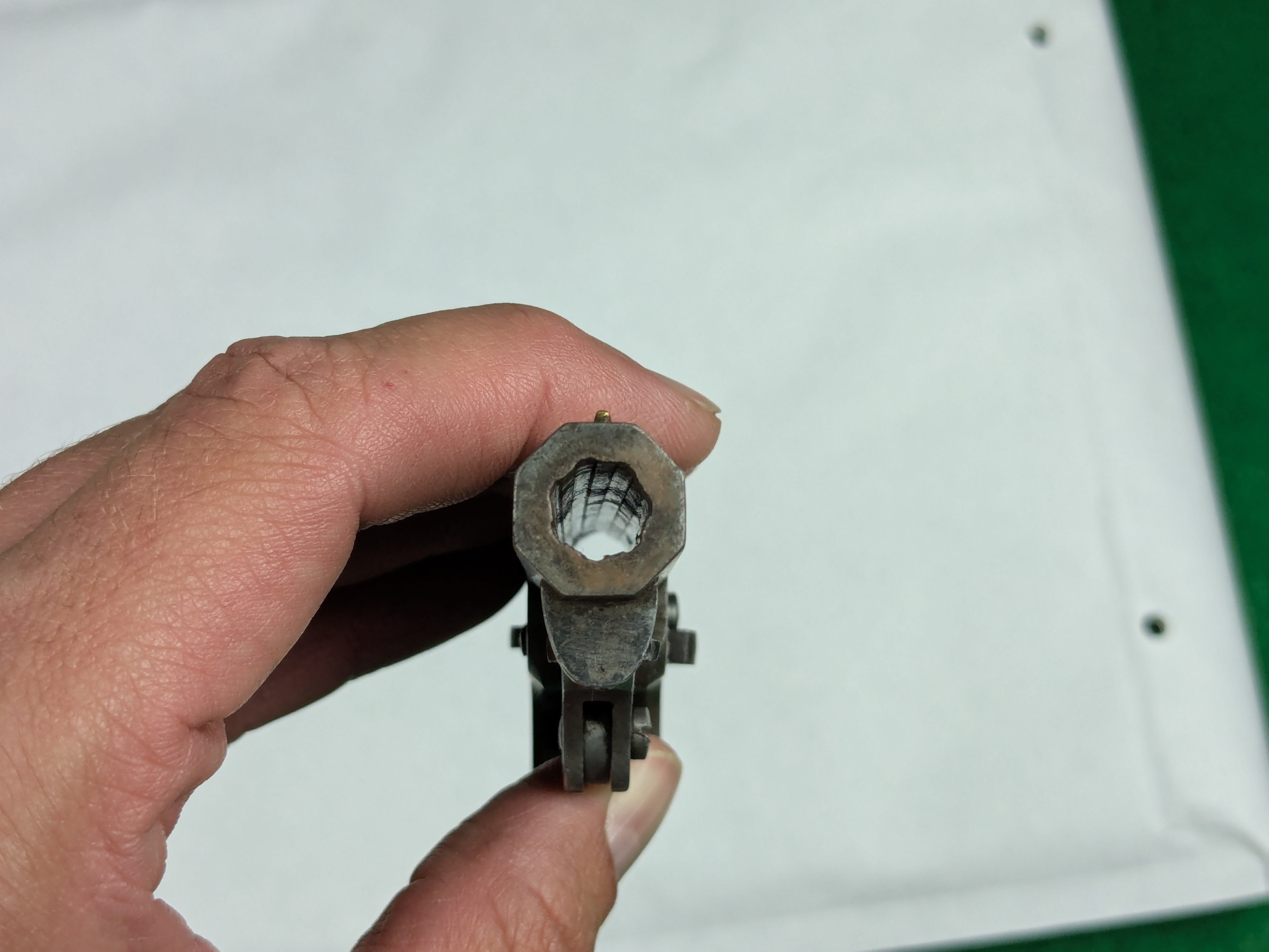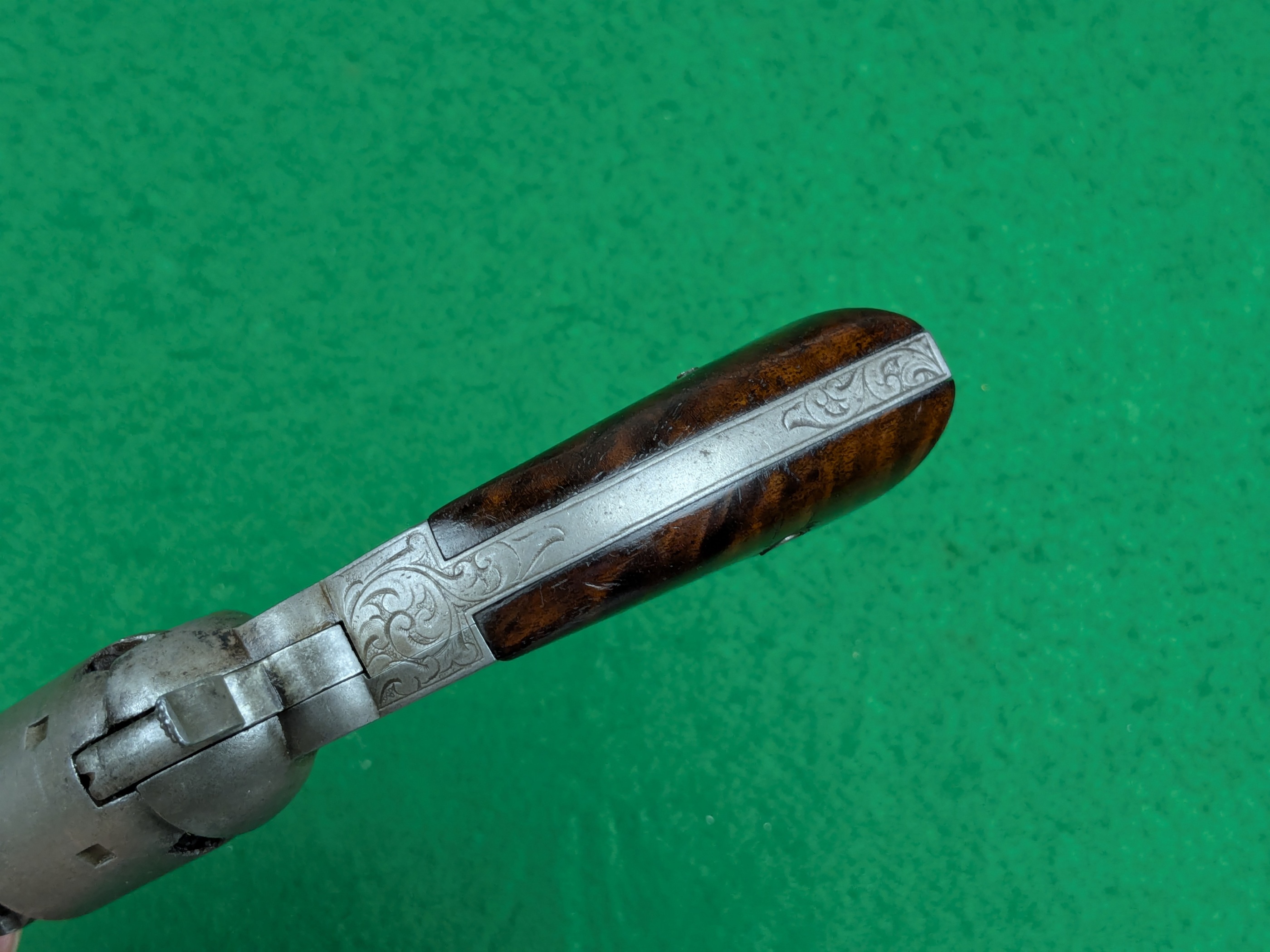 Pipans längd på exemplaret är 4". Trumma för fem skott i kaliber .31". Single-action.