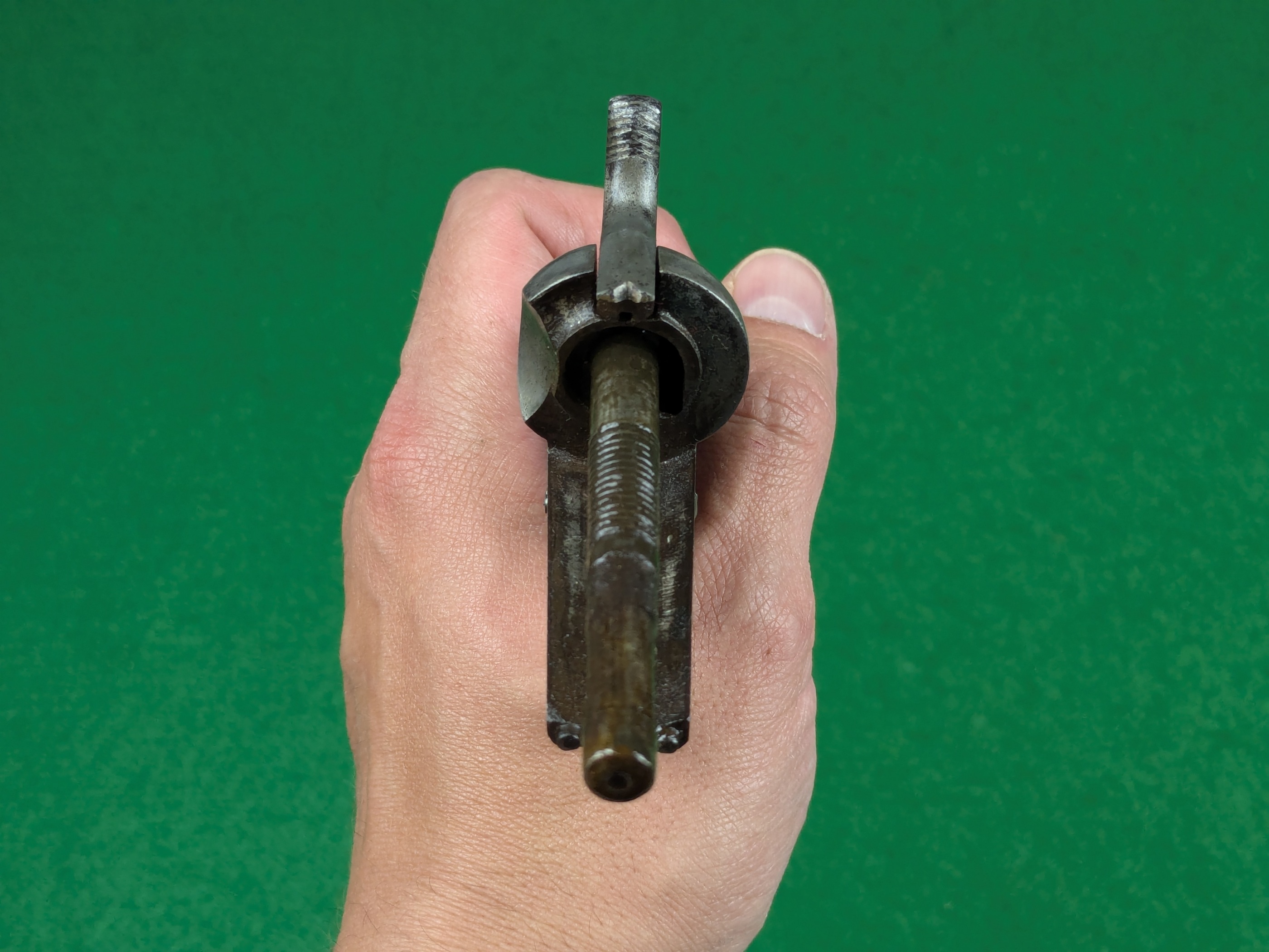 Blånerad, med flamhärdad laddarm, stomme och hane. Varbygel och backstrap av försilvrad mässing. Kolvträ av fernissad valnöt. Trumscen föreställande "The Stagecoach Hold-up". Märkt med serienummer på pipa, laddarm, stomme, varbygel, backstrap, trumaxel, trumma och kil.