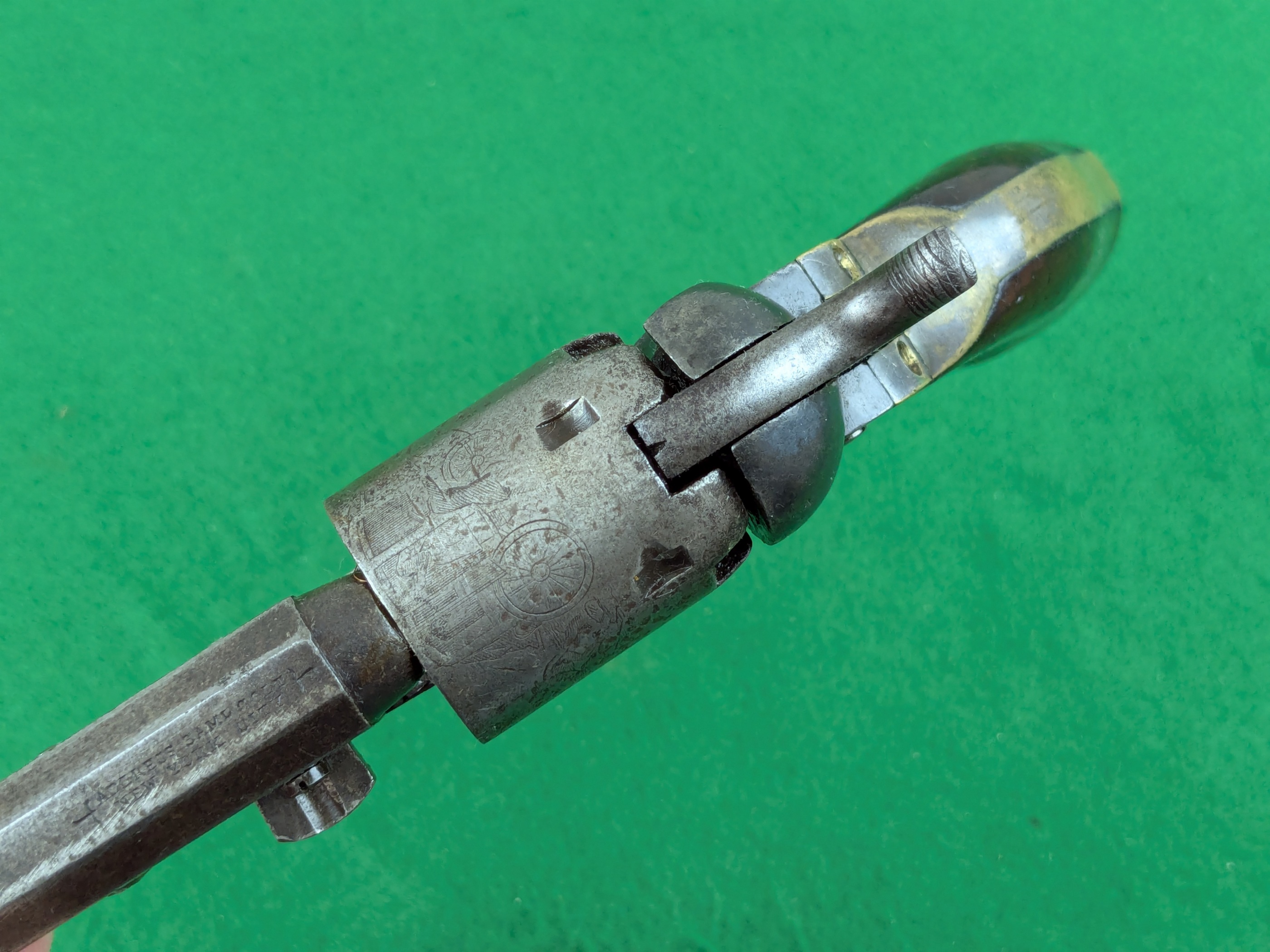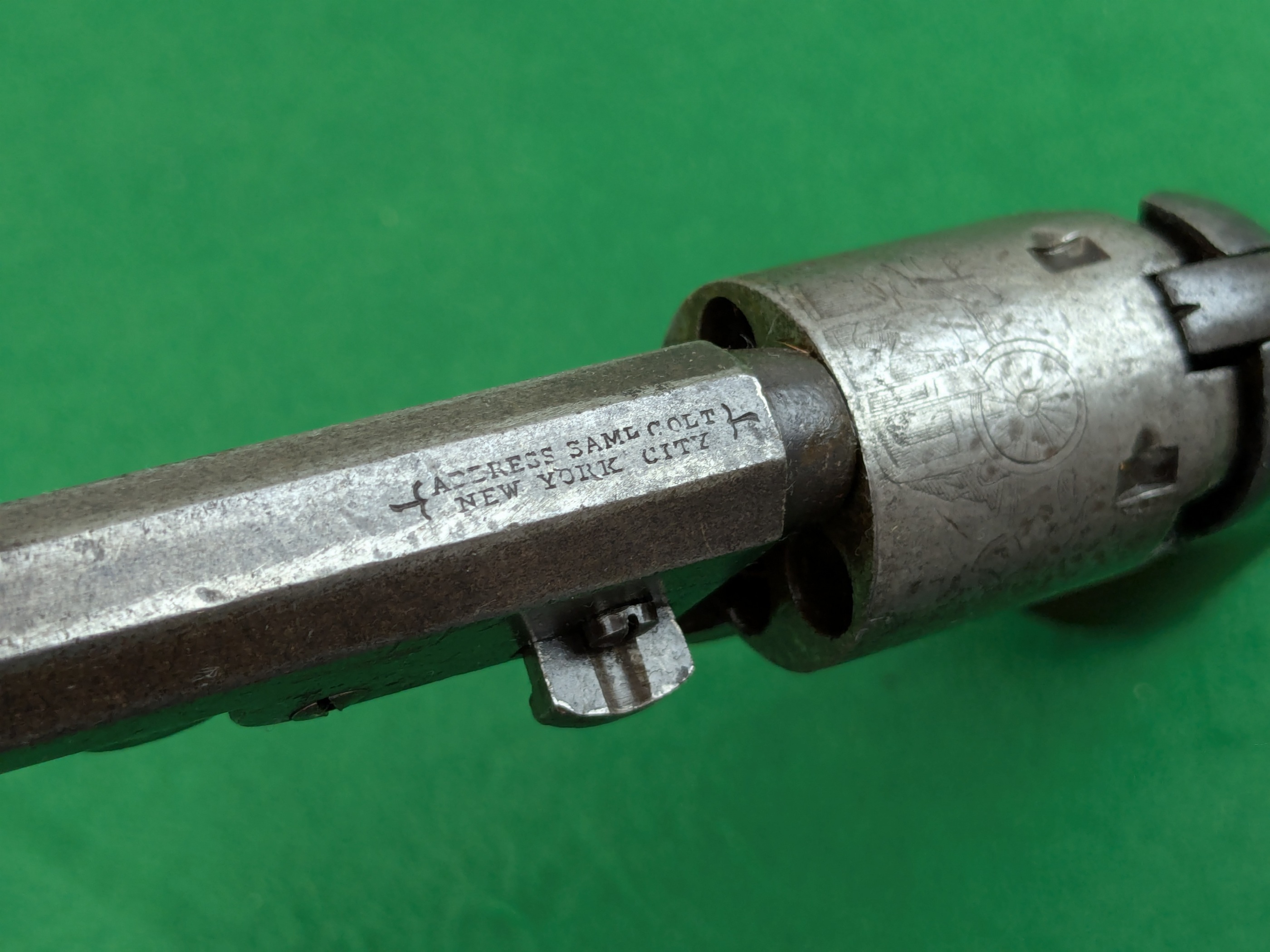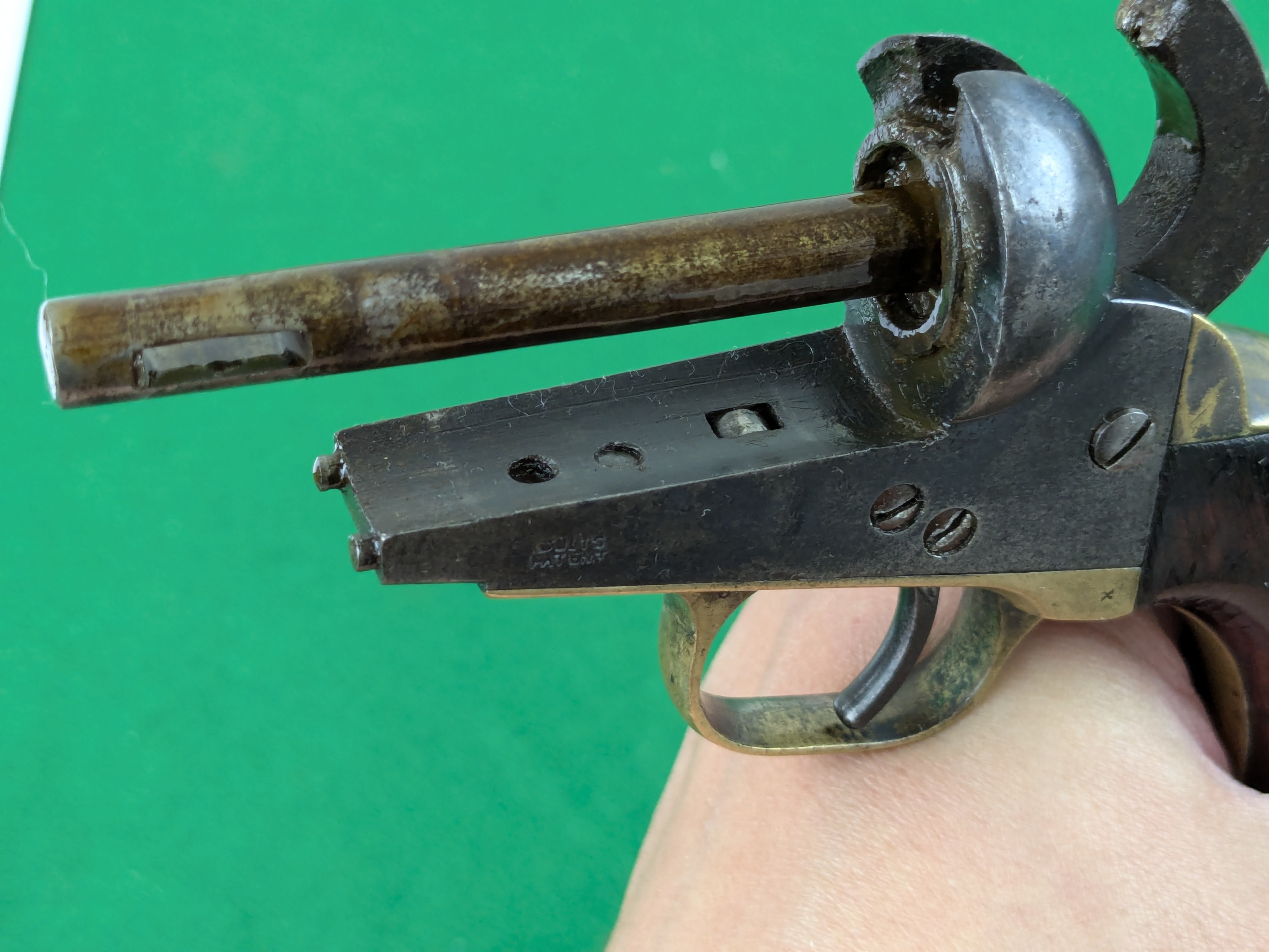 Colt Model 1849 Pocket Revolver med serienummer 89435. Tillverkad år 1854 av Colt's Patent Firearms manufacturing Company i Hartford, Connecticut.