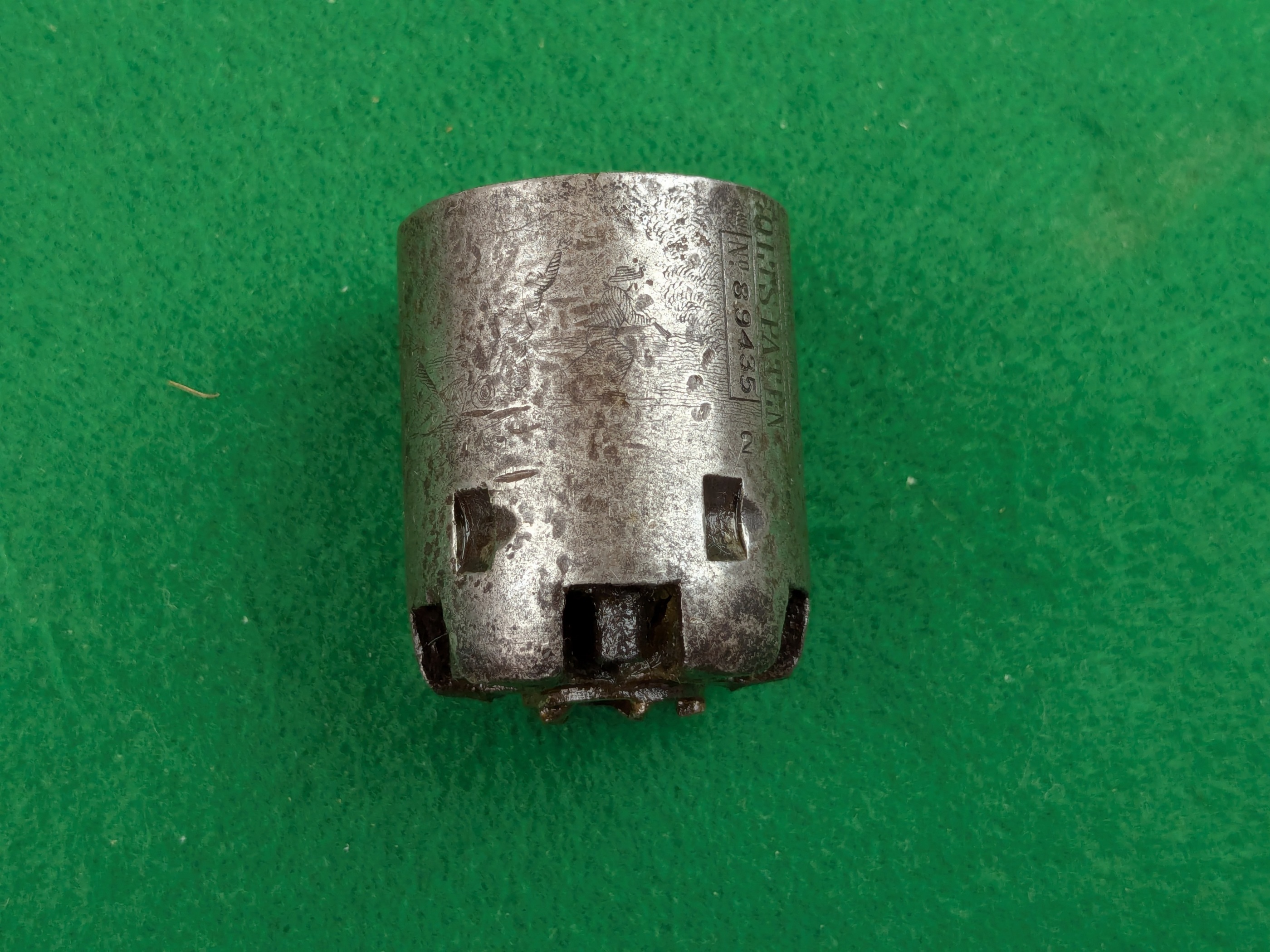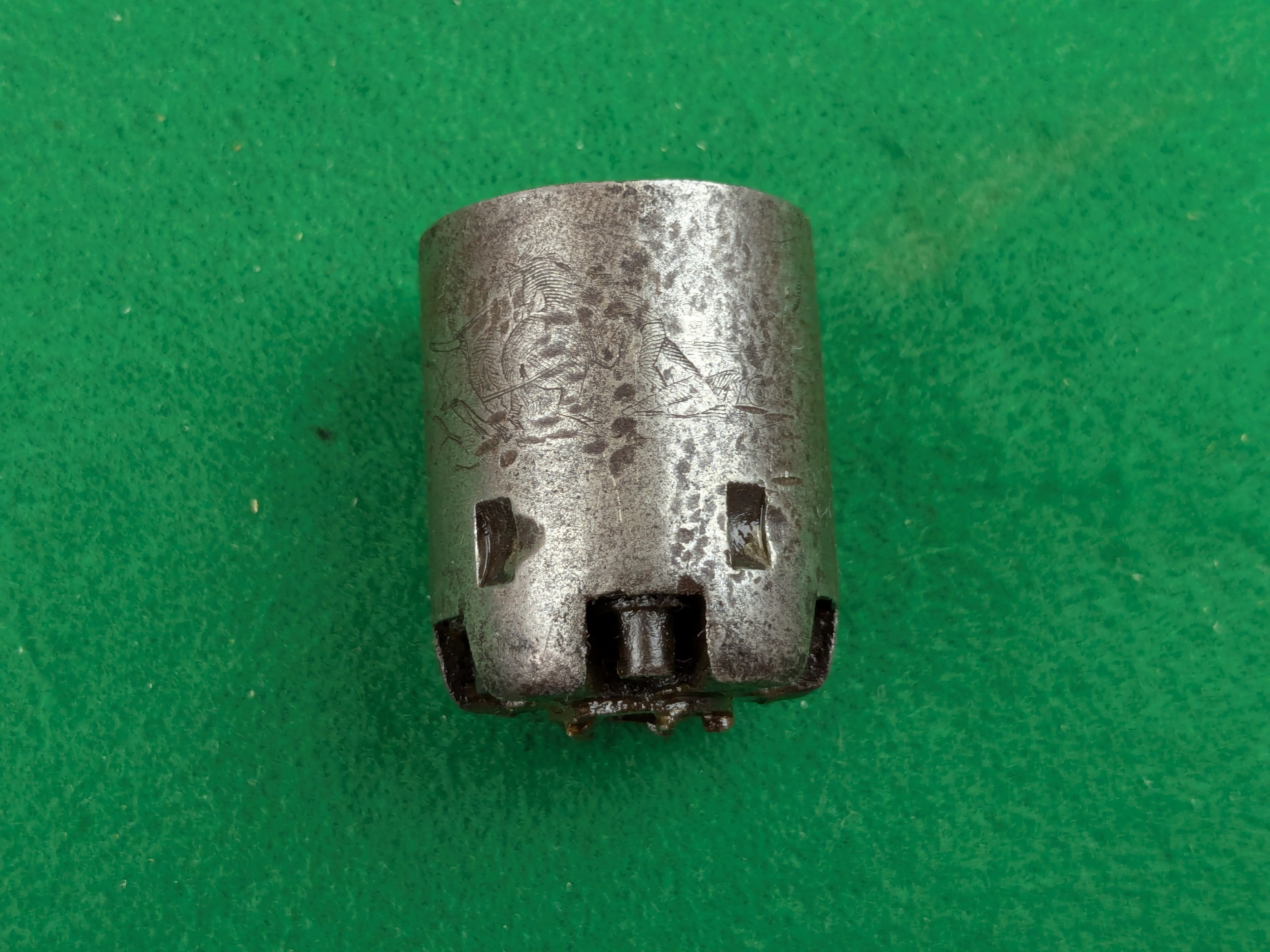 Pipadress i två rader av den tidiga varianten av de tre möjliga. Samma serienummer på alla så märkta delar utom trummans axel som är utbytt. Otroligt nog så är pipans kil den ursprungliga av allt att döma.