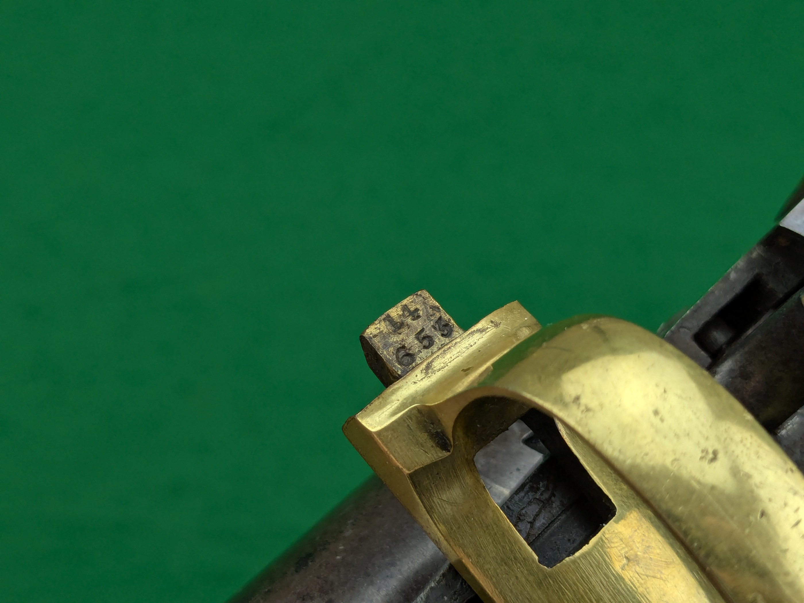 Märkt med militära kontrollbokstäver på de flesta ingående delar. Kartusch på vänster kolvsida av Giles Porter.