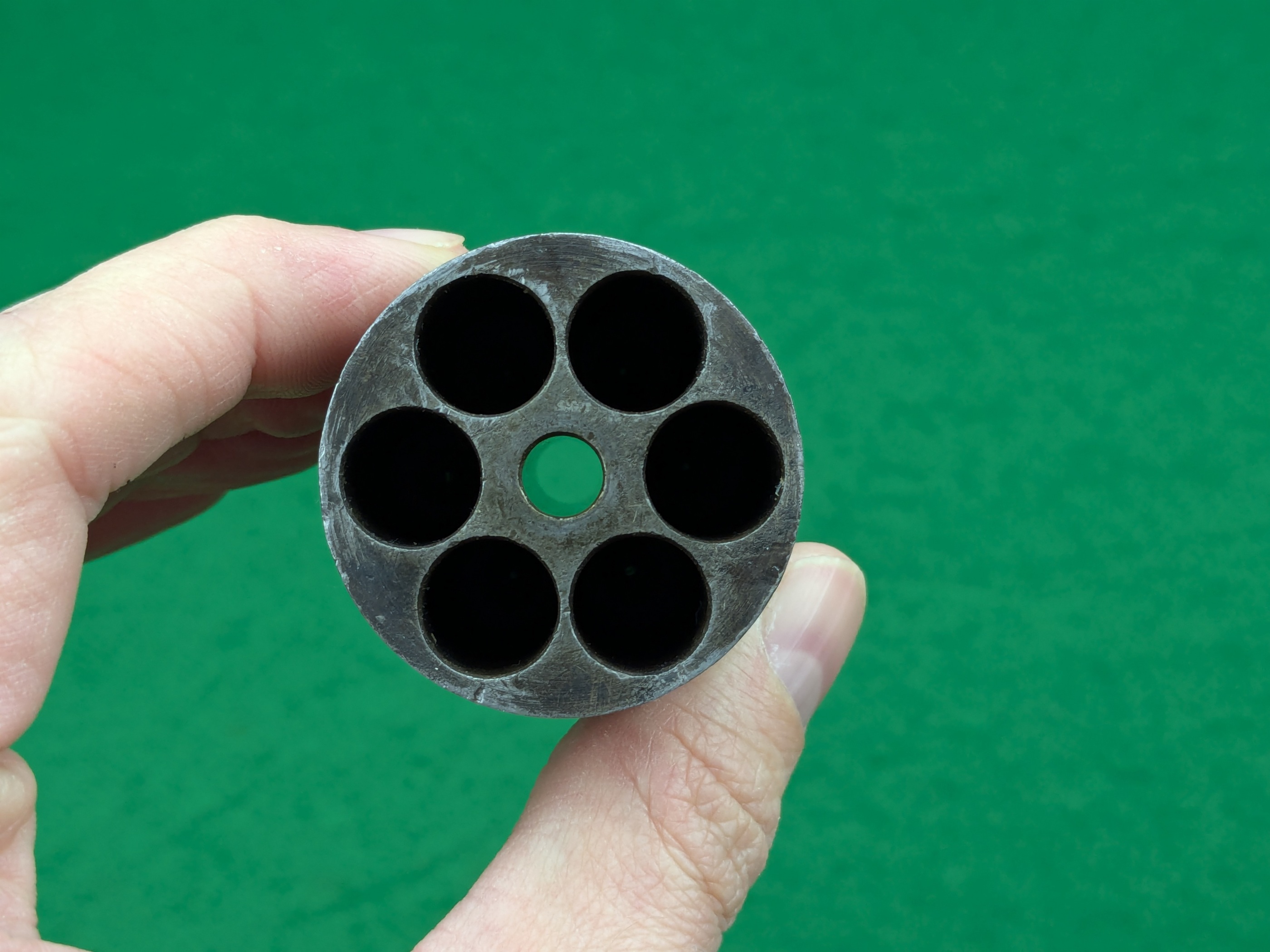 Mekaniskt utmärkt orört originalskick med samtliga ingående större delar original. Ett minimalt spel finns i rotationsriktningen vid helspänn. Spel mellan trumma och pipa ligger på ca 0,20 mm. Det skulle vara mindre om det var rätt serienummer på trumman.. trumman är i ett superskick med blånering kvar i kamrarna till viss del. Pipan är den bästa vi haft på länge, närmast felfri. Laddarmens överläpp är brusten men sitt kvar i sin nit och ramlar inte bort så lätt. Går att åtgärda för en mindre summa, eller låt det vara.