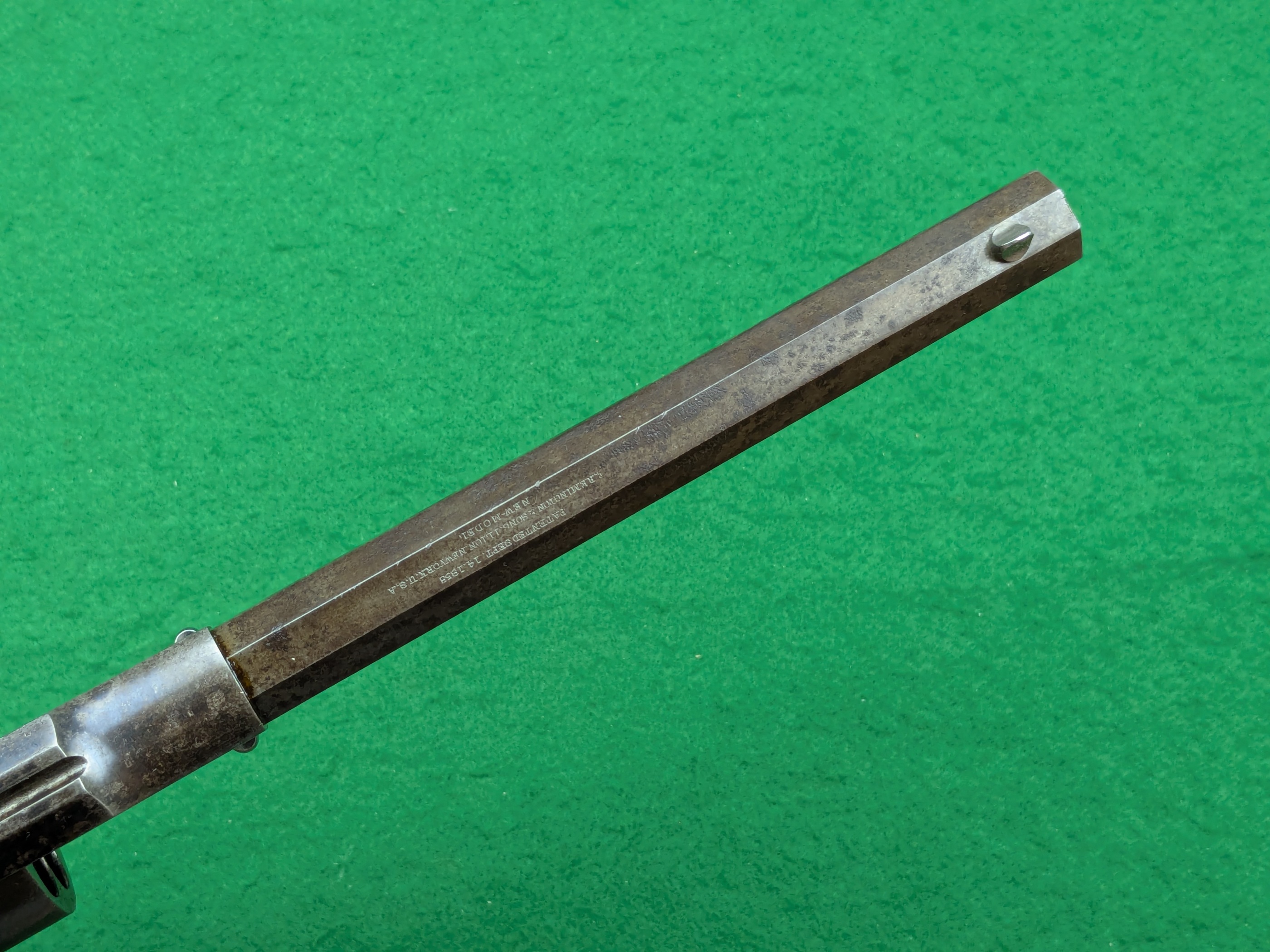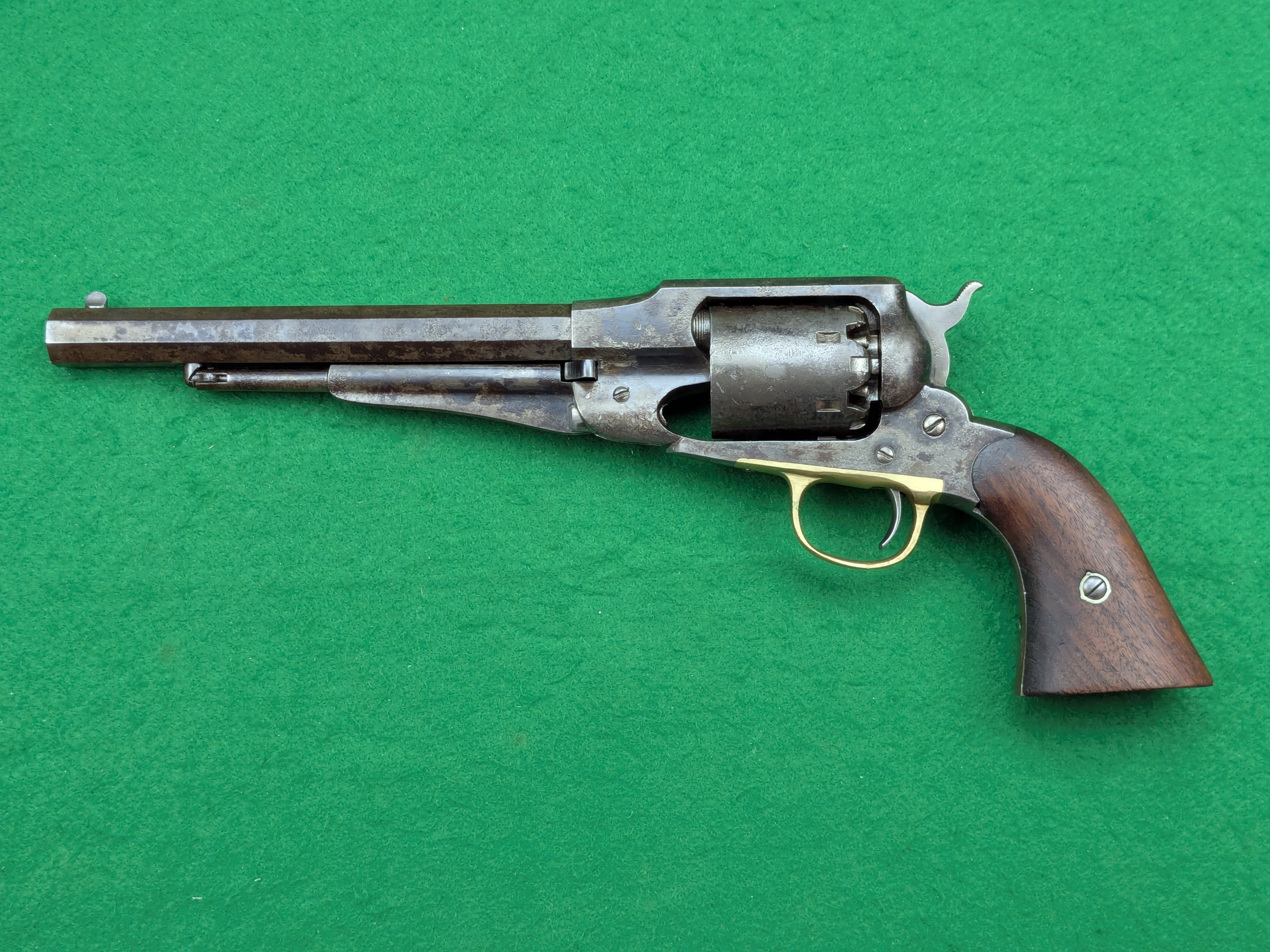 Militära kontrollbokstäver och kartusch på vänster kolvsida av Giles Porter. Revolvern är en av de 106 000 exemplar som såldes direkt till Nordstaterna under amerikanska inbördeskriget. Samma serienummer pryder pipa, stomme, varbygel och lite svårt att se, insidorna av kolvsidorna med blyerts. Trumman kommer från en annan likadan revolver och matchar den här revolverns patina. Trumman har ett annat serienummer.