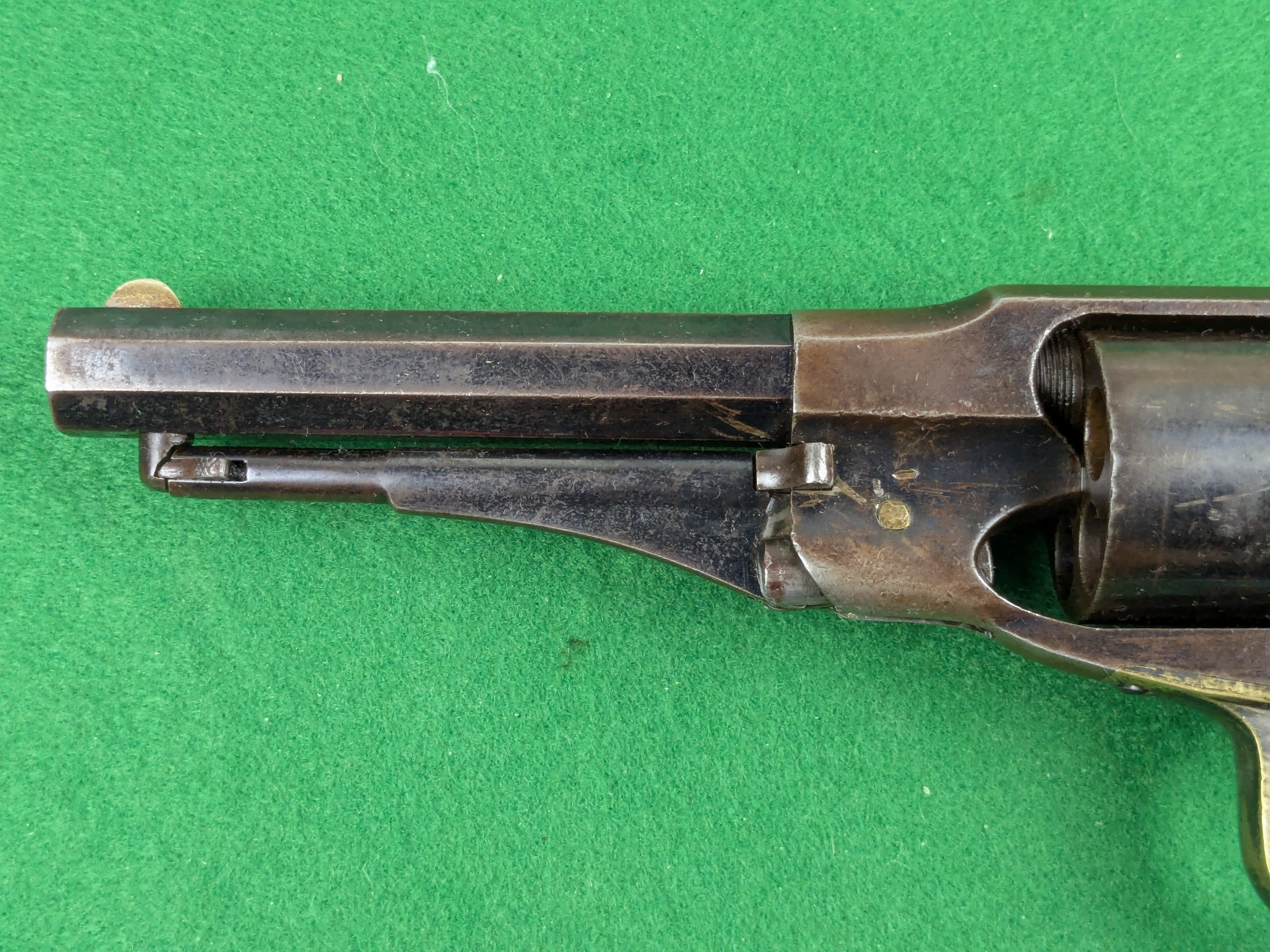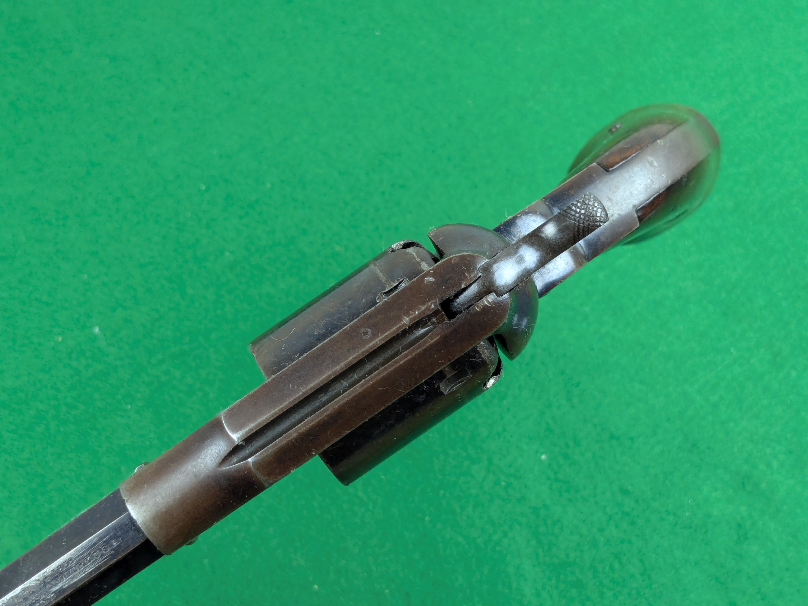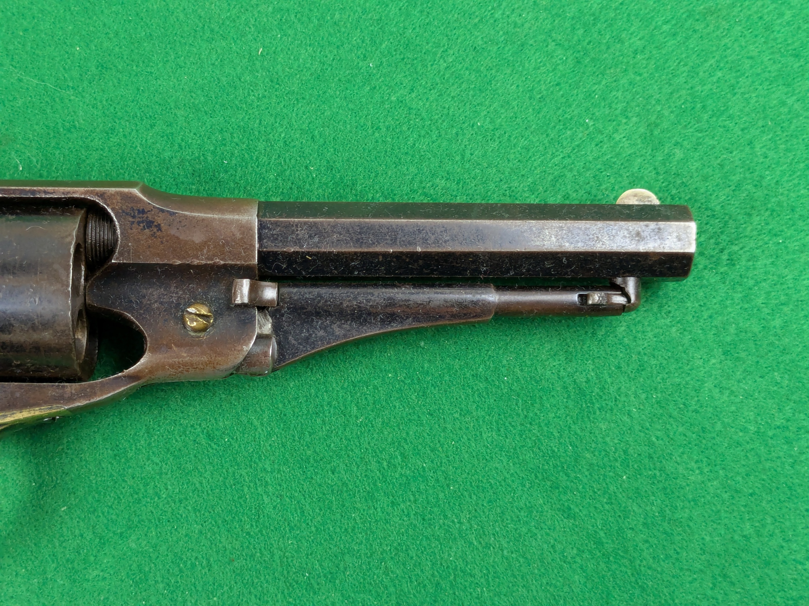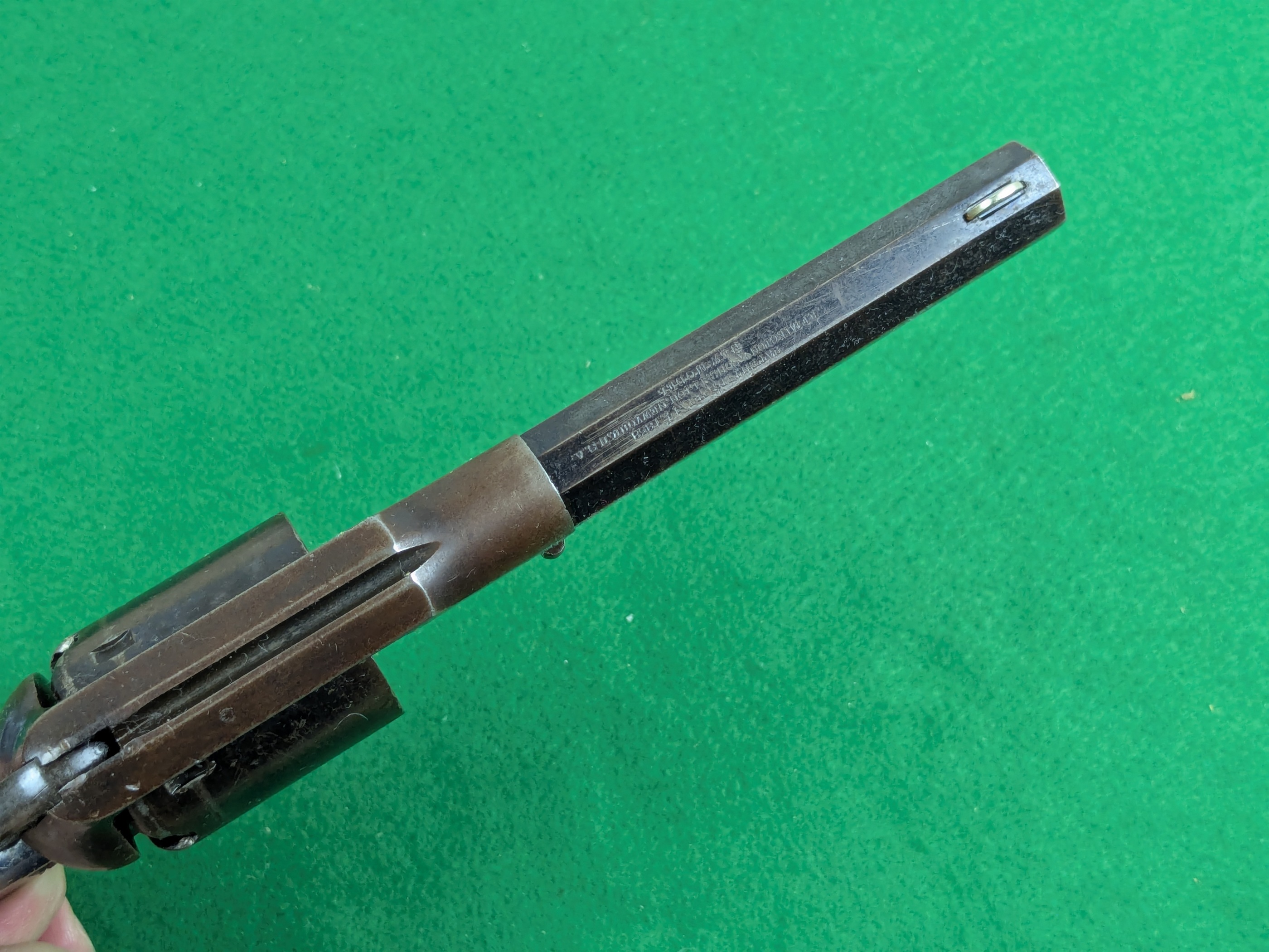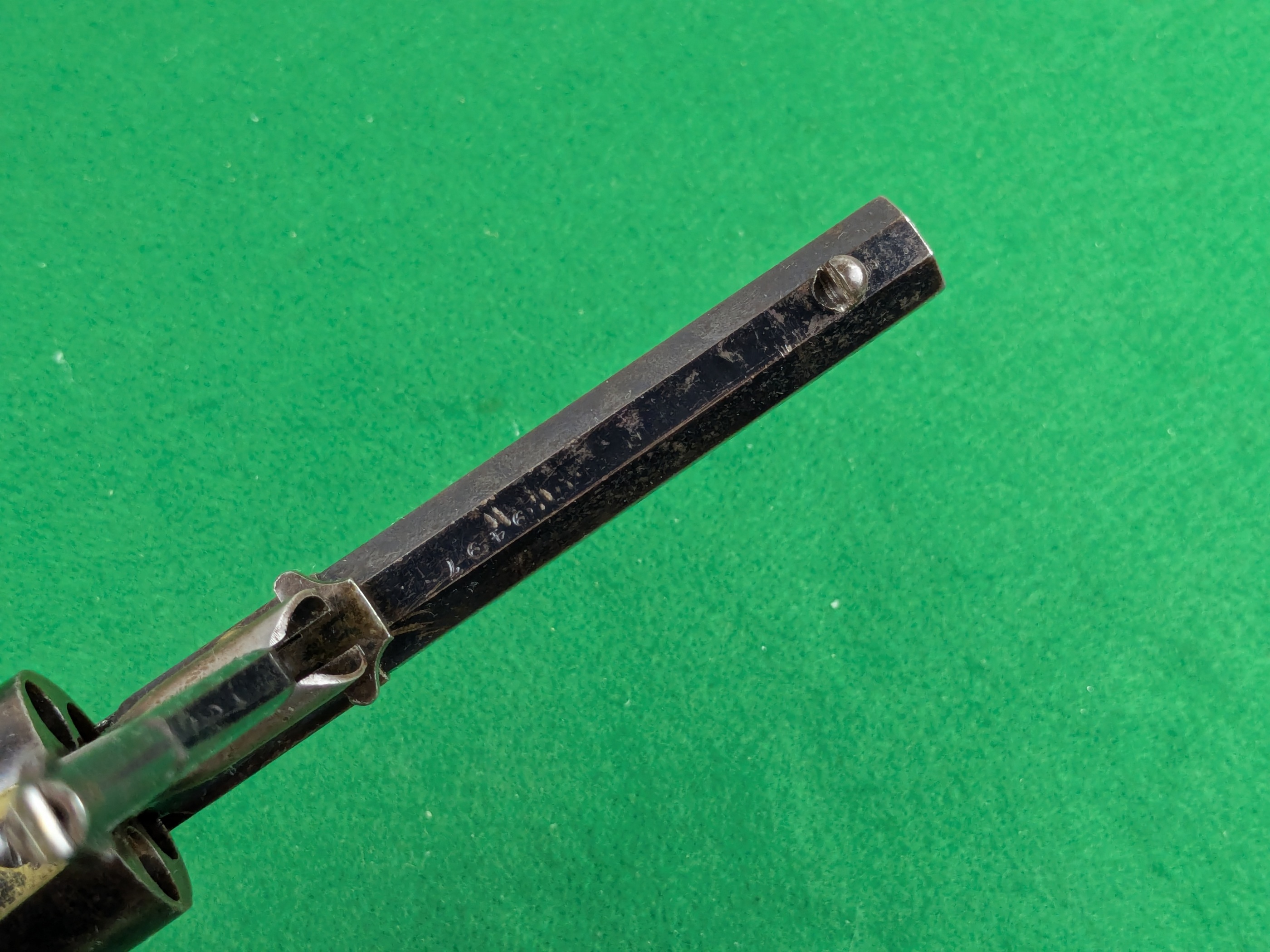 Pipans längd på detta exemplar är 5-1/2". Trumma för fem skott i kaliber .36". Single-action