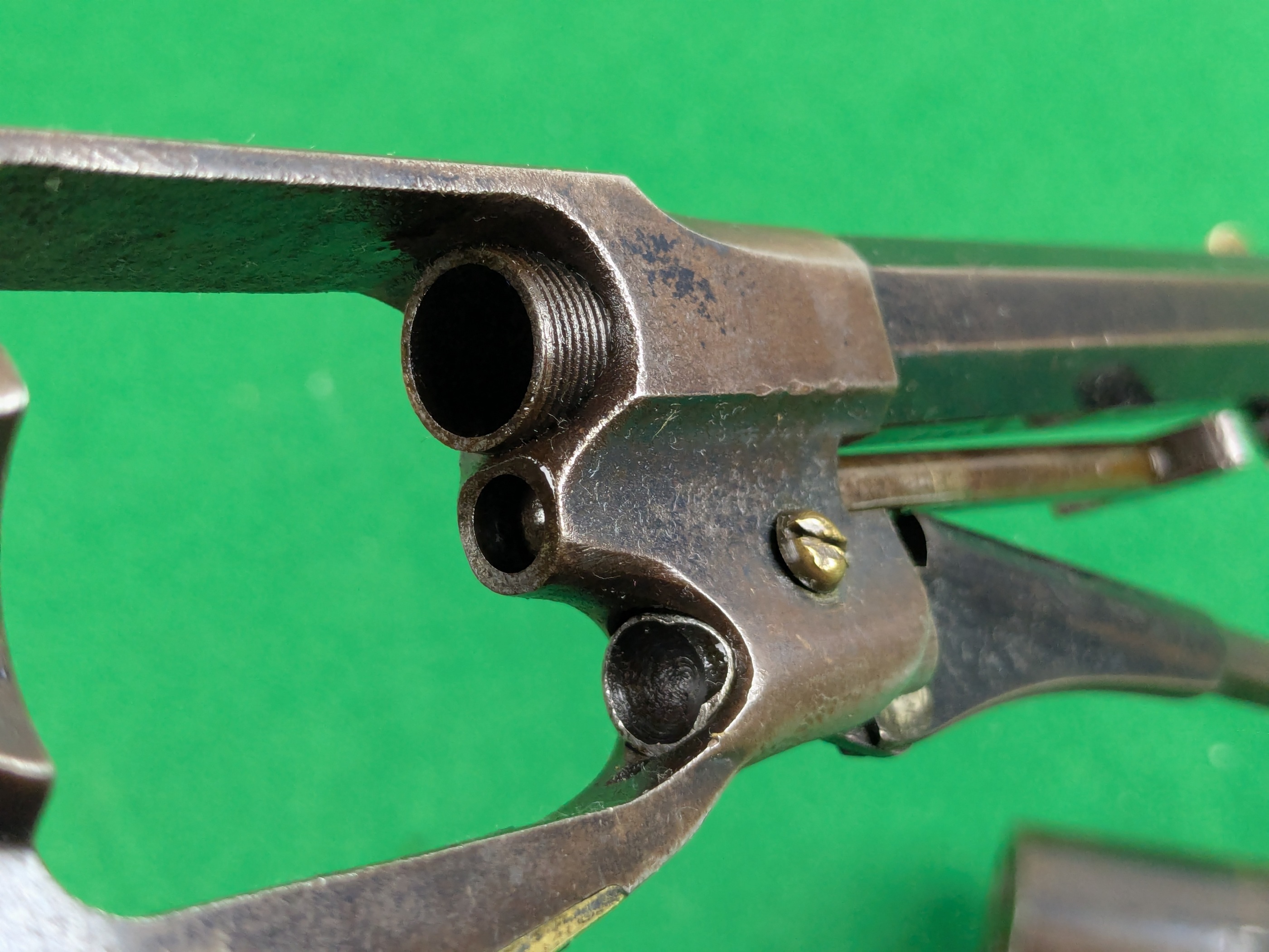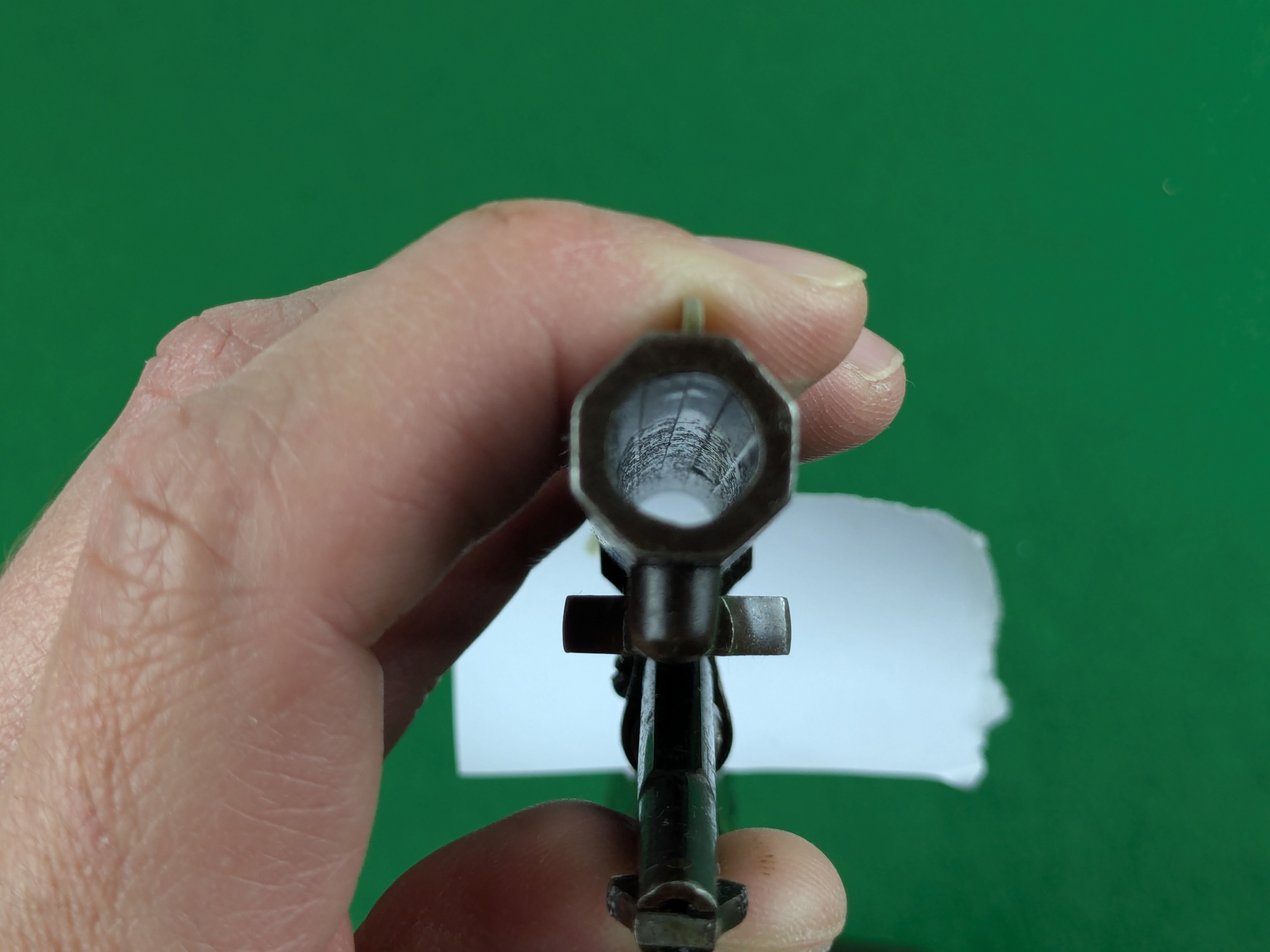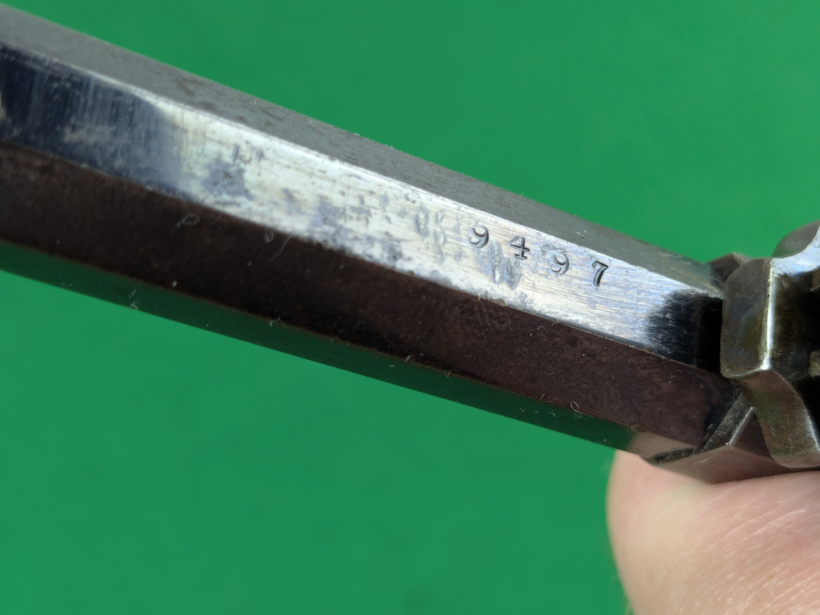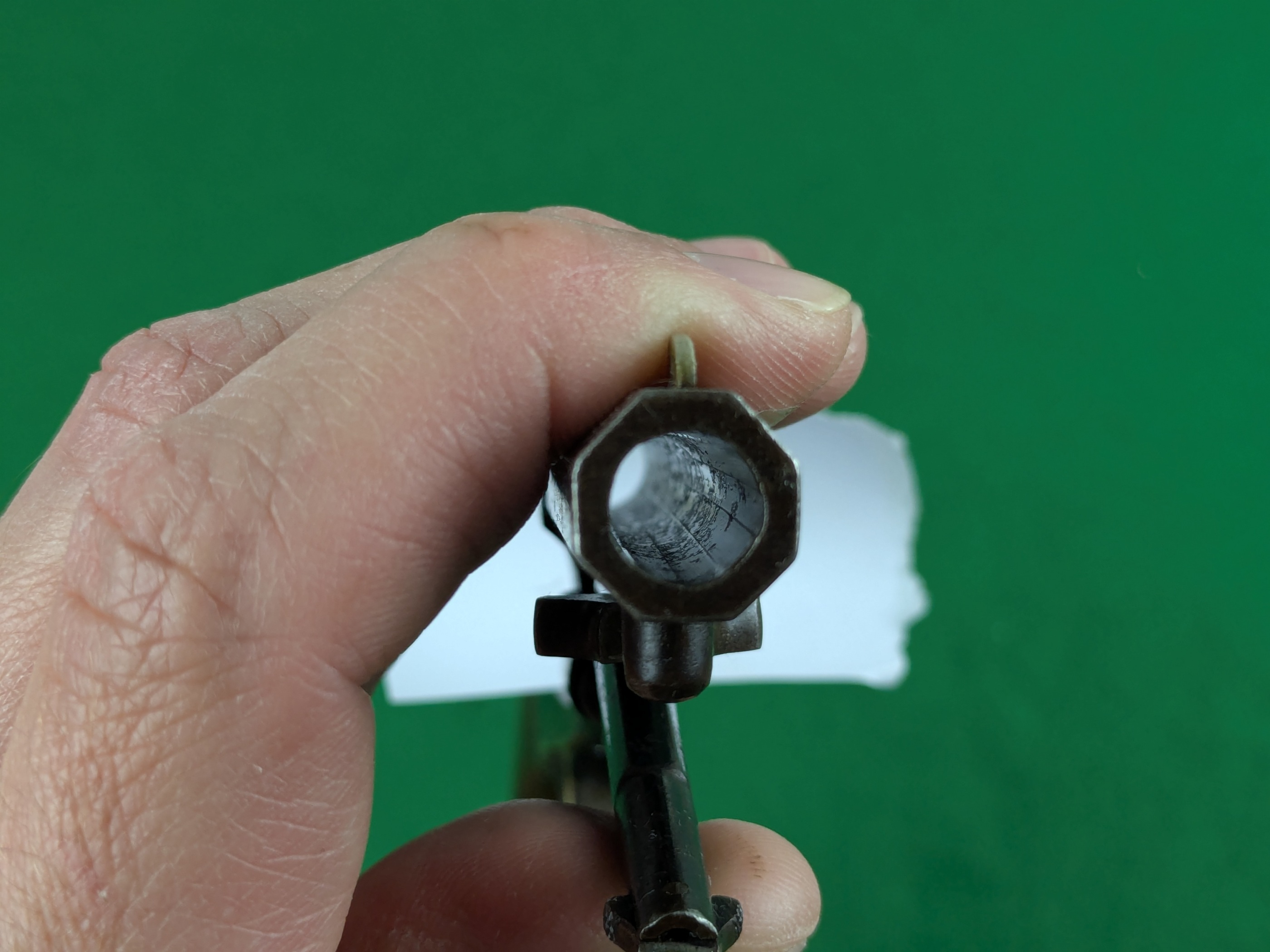 Pipans längd på detta exemplar är 5-1/2". Trumma för fem skott i kaliber .36". Single-action