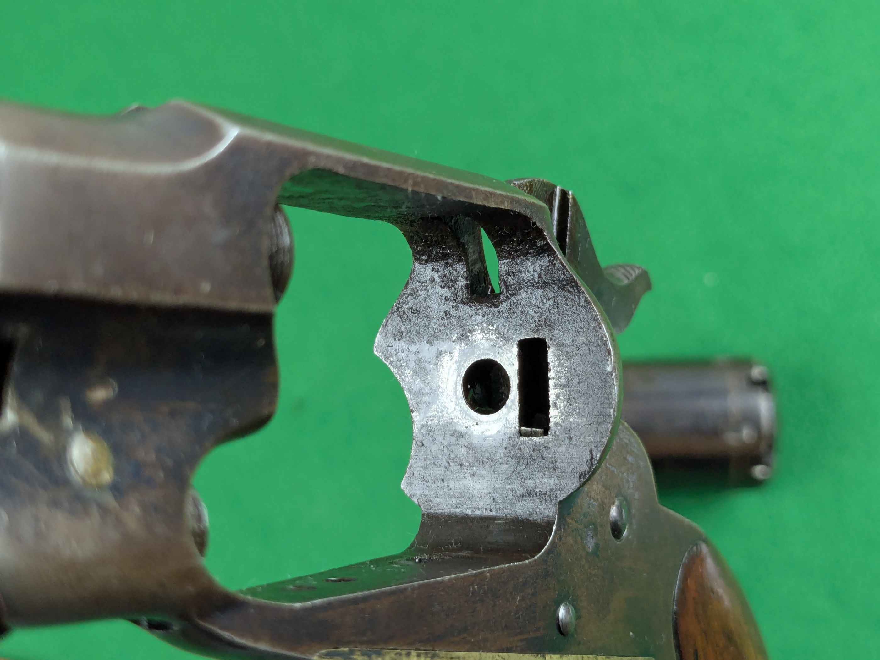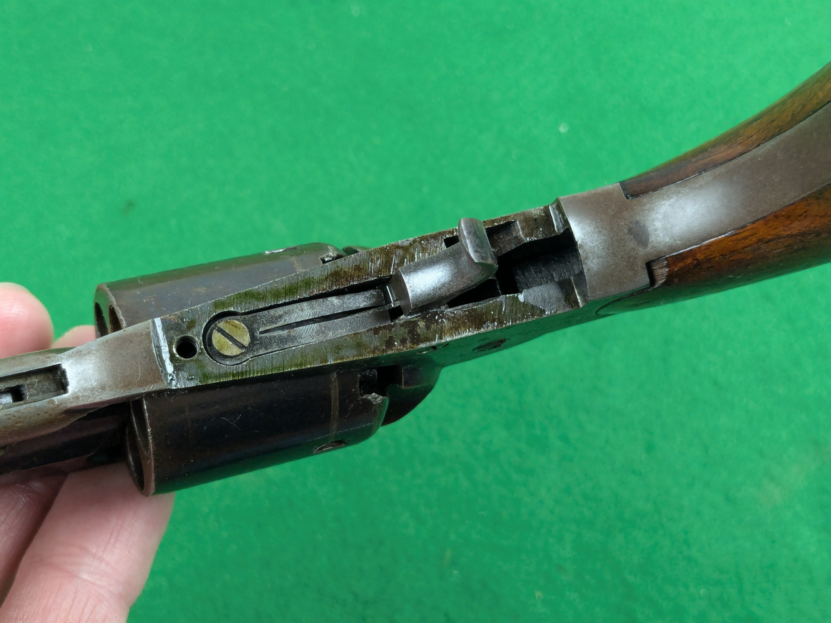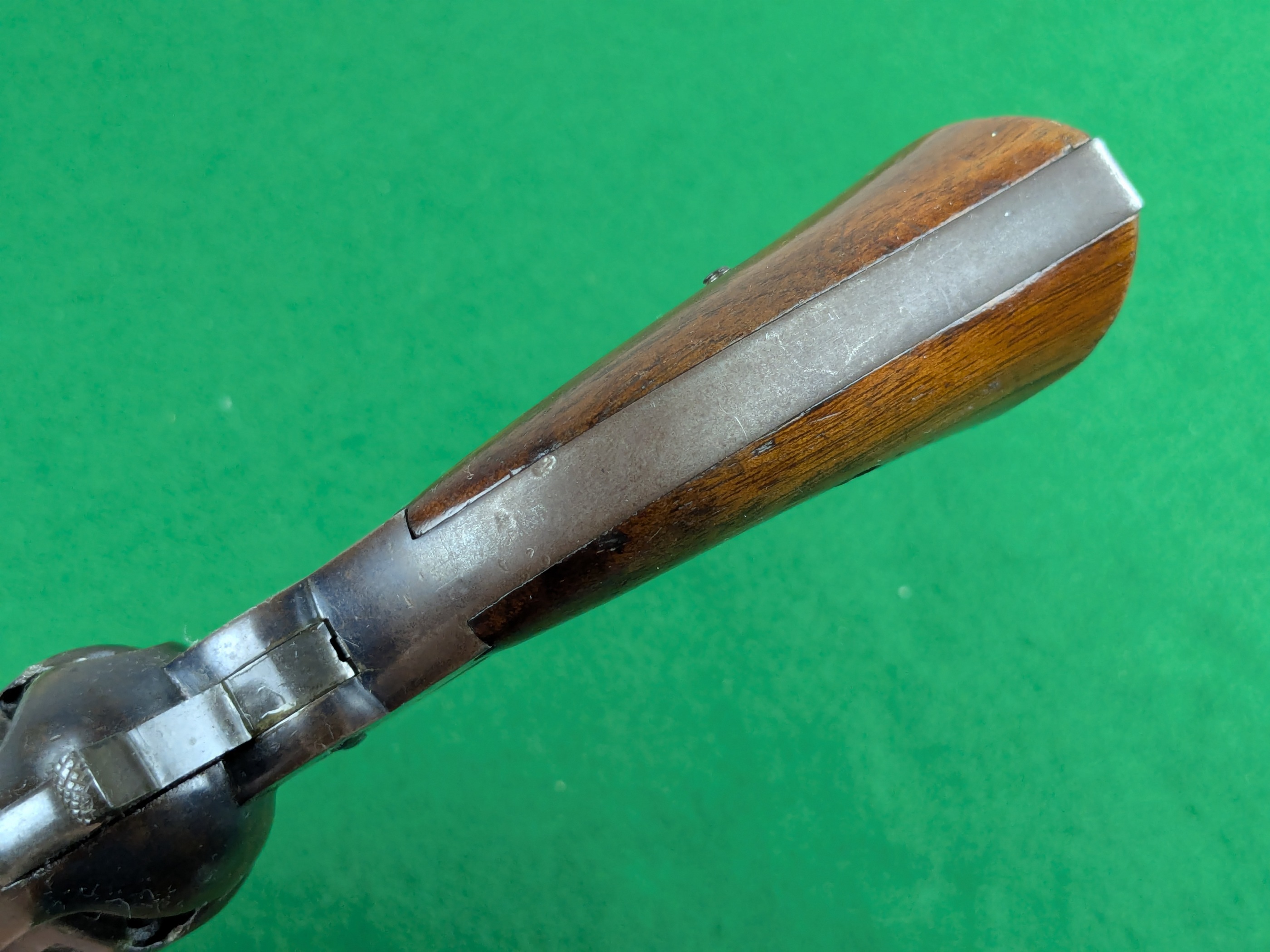 En vilda västern revolver i lagom storlek och här i ett välbevarat originalskick. Man kan se en riklig originalblånering på pipan och en hel del på stommen. Kolvsidorna behåller riklig fernissa och har perfekt passform mot stommen. Varbygeln täcks av en ärligt patinerad originalförsilvring som mestadels är mörk idag, mer än hälften är kvar.