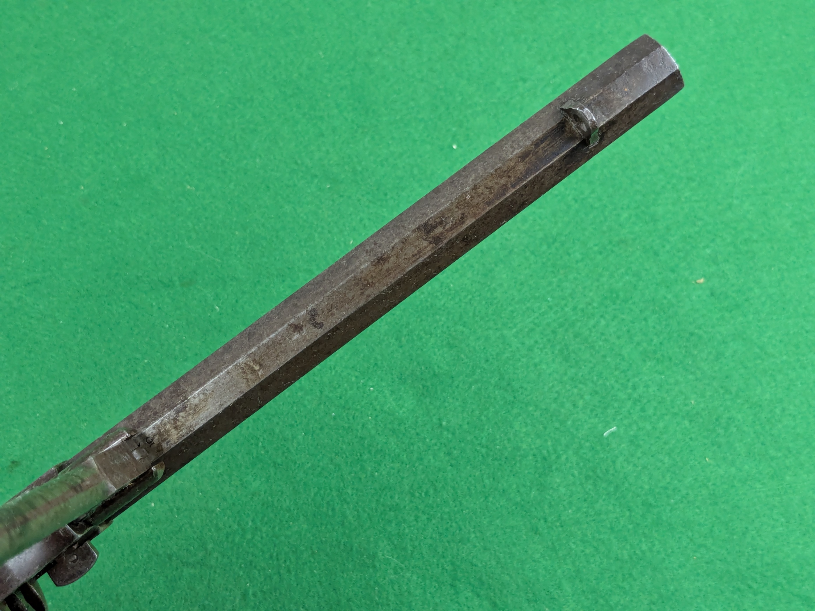 Blånerad, med flamhärdad laddarm och hane. Varbygel av mässing och kolvsidor av fernissad valnöt. Trumscen med olika djur och fartygsmotiv, svagt rullgraverad. Tvåradig pipadress. Samma serienummer på så märkta delar.